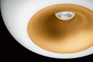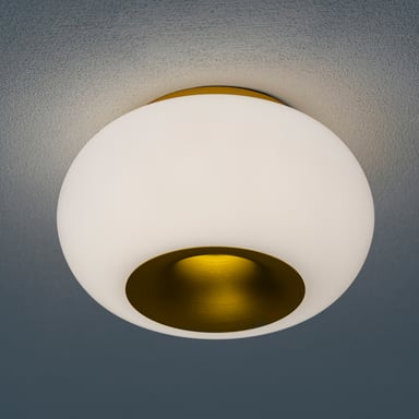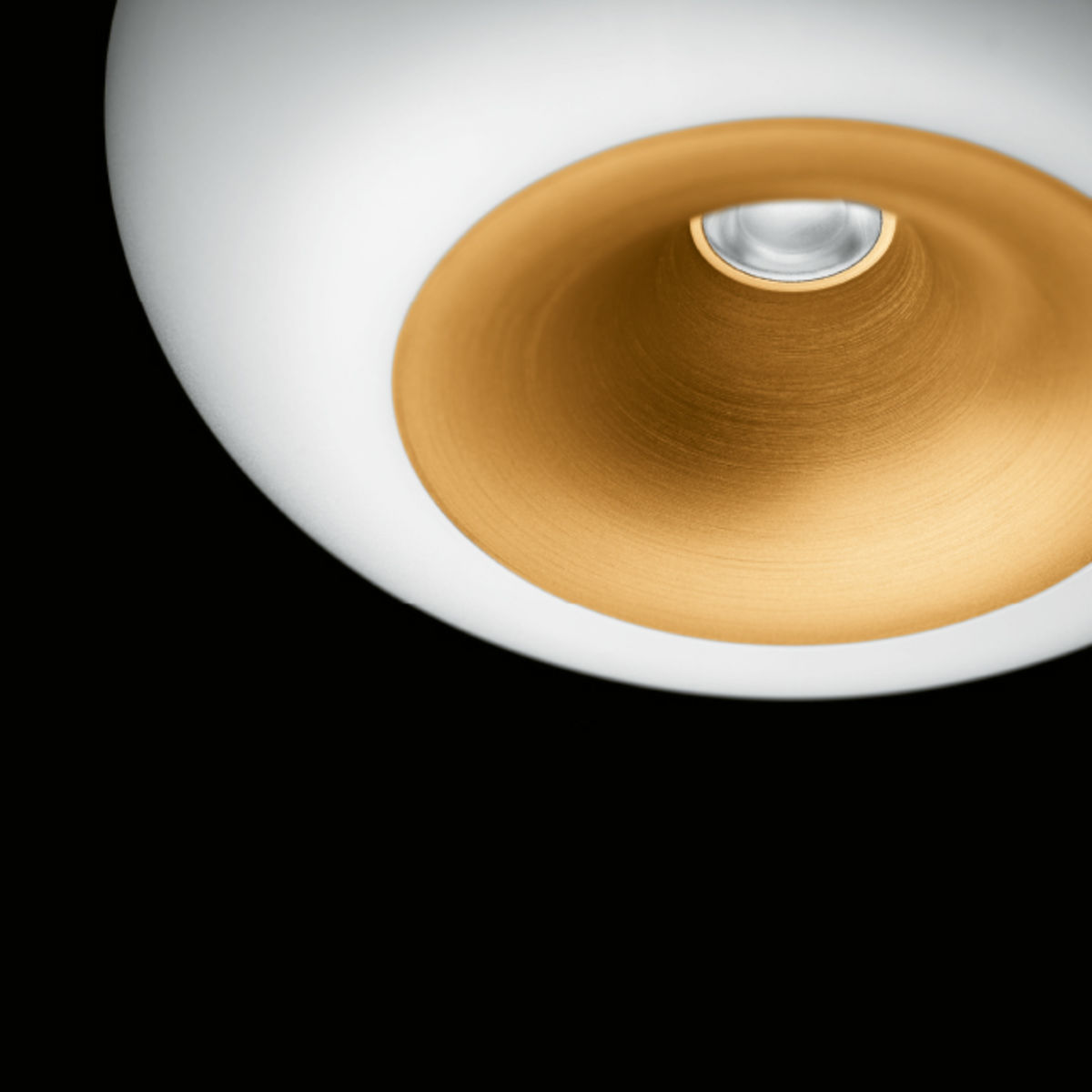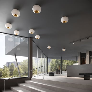 These ceiling luminaires feature a flattened spherical shape. The metal cone on the inside of the white luminaire body creates a striking contrast. This fascinating combination gives an aesthetic touch while also creating a pleasant atmosphere in the room with soft light.