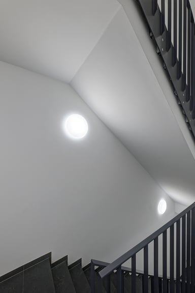 The glass projection is at the front and centre of this luminaire series: without a trim ring, it subtly illuminates the installation surface and produces a characteristic light effect. If a trim ring is added, the projection disappears, resulting in a more compact shape and reduced light emission onto the installation surface. The luminaires, which are designed to be reliable and cost-efficient, are available with hand-blown, satin matt opal glass or an impact-resistant, translucent synthetic cover and feature a replaceable BEGA LED module.