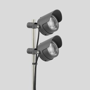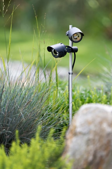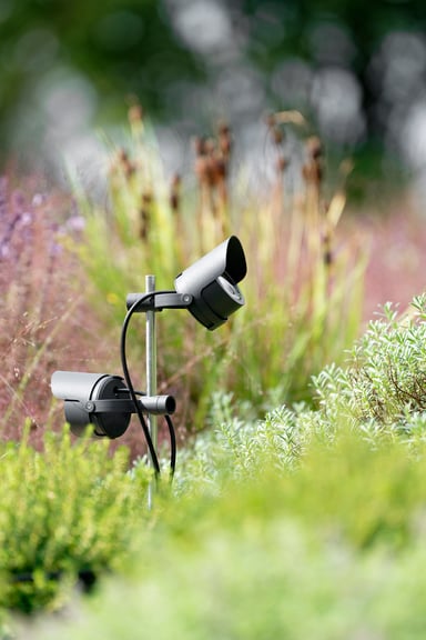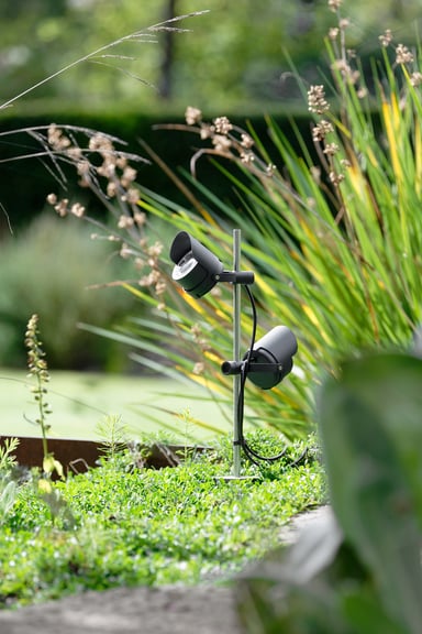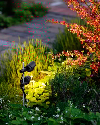 BEGA UniLink® Play garden floodlights are used for portable illumination in private gardens. Shrubs, bushes and small trees can be lit individually, as can steps or path sections. Together with individual adjustability, the flat beam illumination opens up a variety of possibilities for garden lighting. On or two BEGA UniLink® Play garden floodlights can be positioned on a vertical tube with earth spike at any height. The removable shields, adjustable by 140°, provide additional glare-free lighting alternatives.