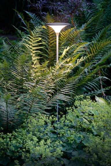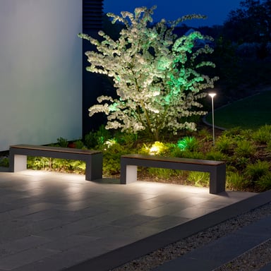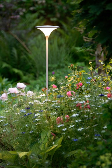 The upwardly shielded garden luminaires of our BEGA UniLink® system create atmospheric light points in private gardens and patio areas. The light-diffusing synthetic cover produces a pleasant and very wide beam distribution of light in the environment to be illuminated. Specific areas, plants or flowerbeds can be atmospherically accentuated in this way. Luminaires can be repositioned easily as the seasons change in the garden. These portable luminaires can simply be placed in lawns, flowerbeds or plants with an earth spike.