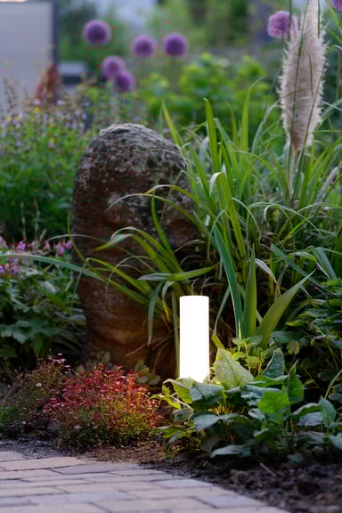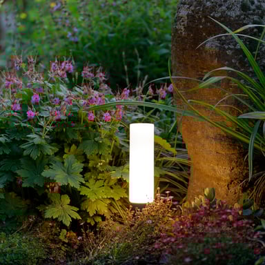 These luminaires for private gardens create a pleasant light effect along paths, on terraces and in flower beds. The glass unit made of high-quality three-ply opal glass in the shape of a cylinder acts as an unshielded light distributor.