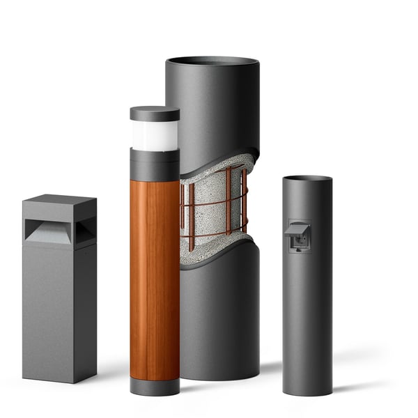 By means of a robust mechanism, we have made it possible to combine bollard heads and bollard tubes with integrated auxiliary components at will.